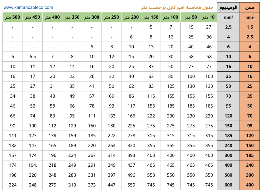 جدول محاسبه کابل (جدول آمپر کابل) سه فاز
