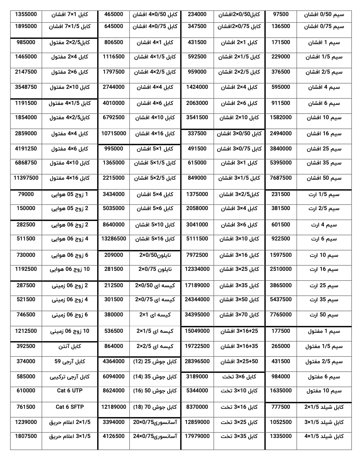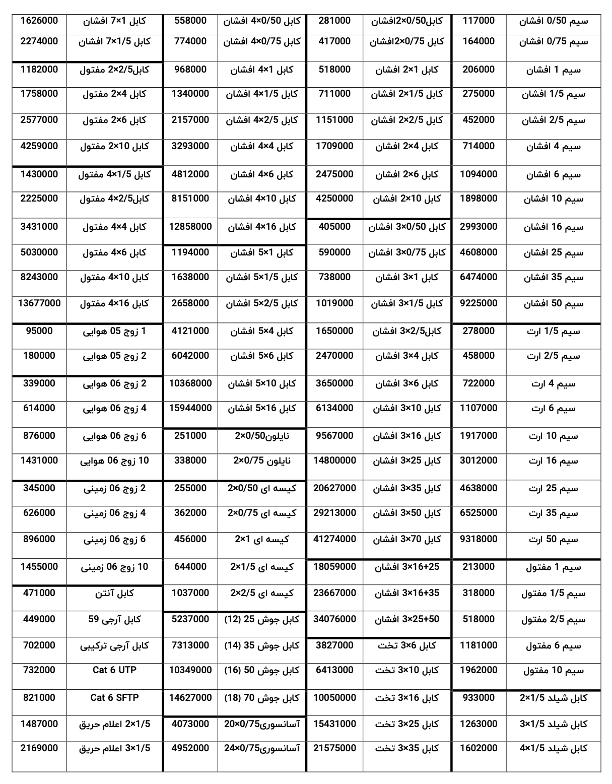 در این لیست، قیمت انواع محصولات از جمله سیم برق کمان، کابل برق کمان، کابلهای افشان، مفتولی و سایر مدلها به تفکیک قابل مشاهده است.